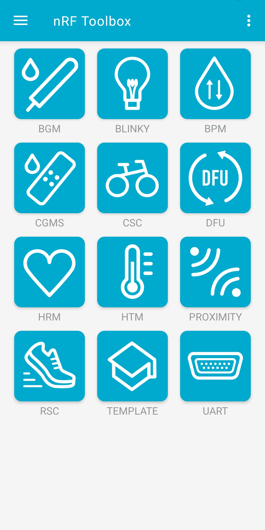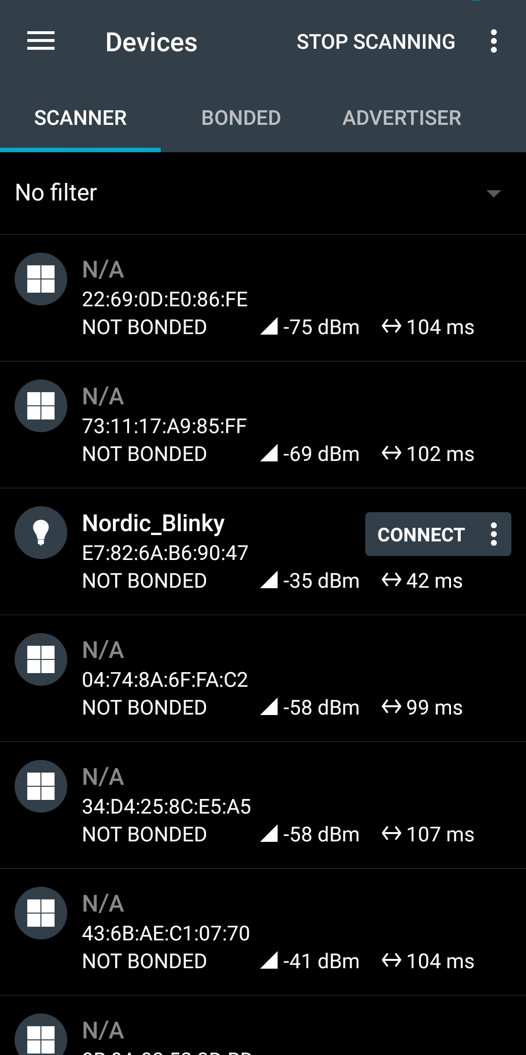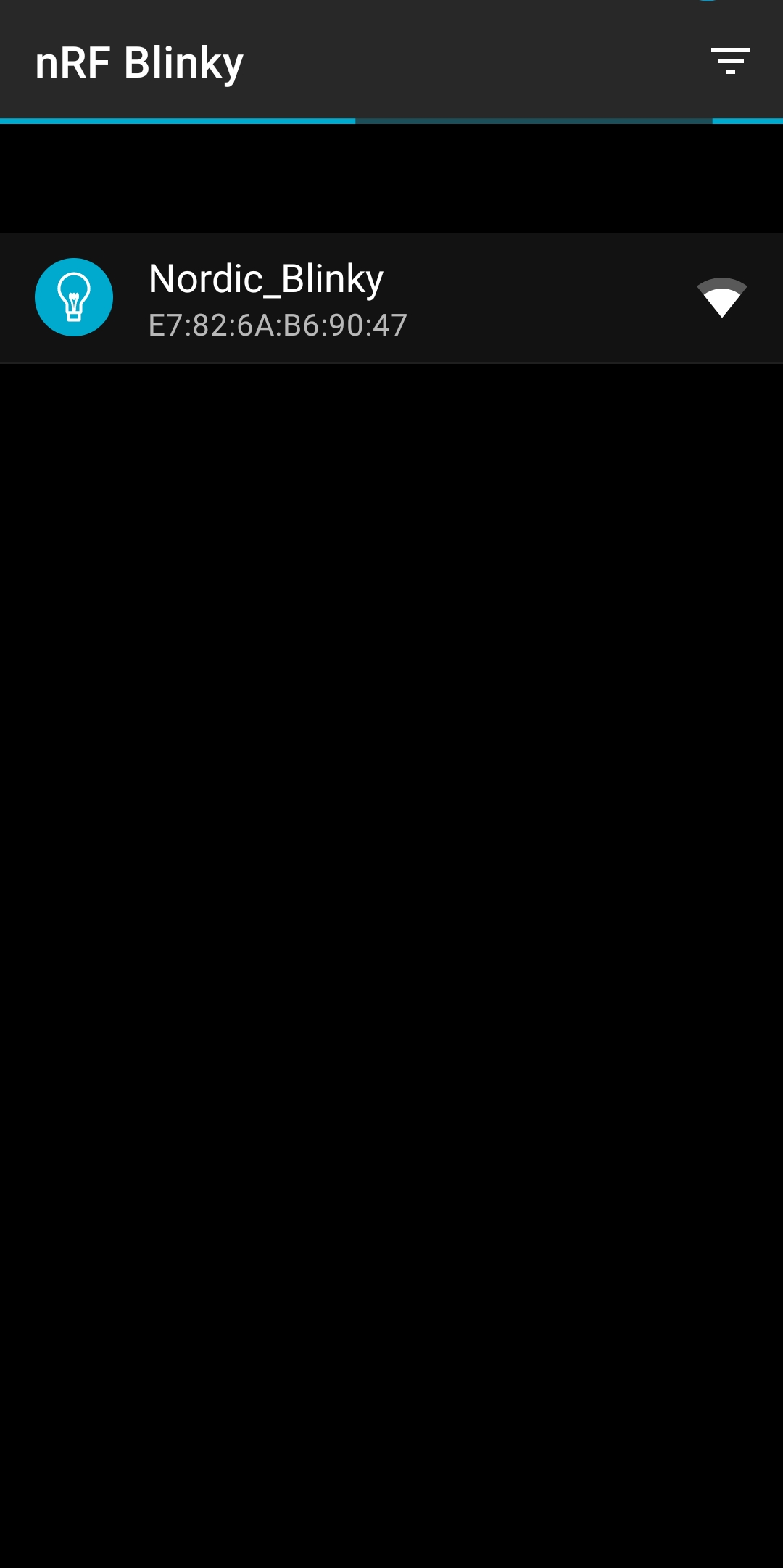nRF Toolbox 애플리케이션을 실행하고 BLINKY라고 적힌 아이콘을 선택하면 사진과 같이 목록에 Nordic_Blinky가 나오는 것을 확인할 수 있다.