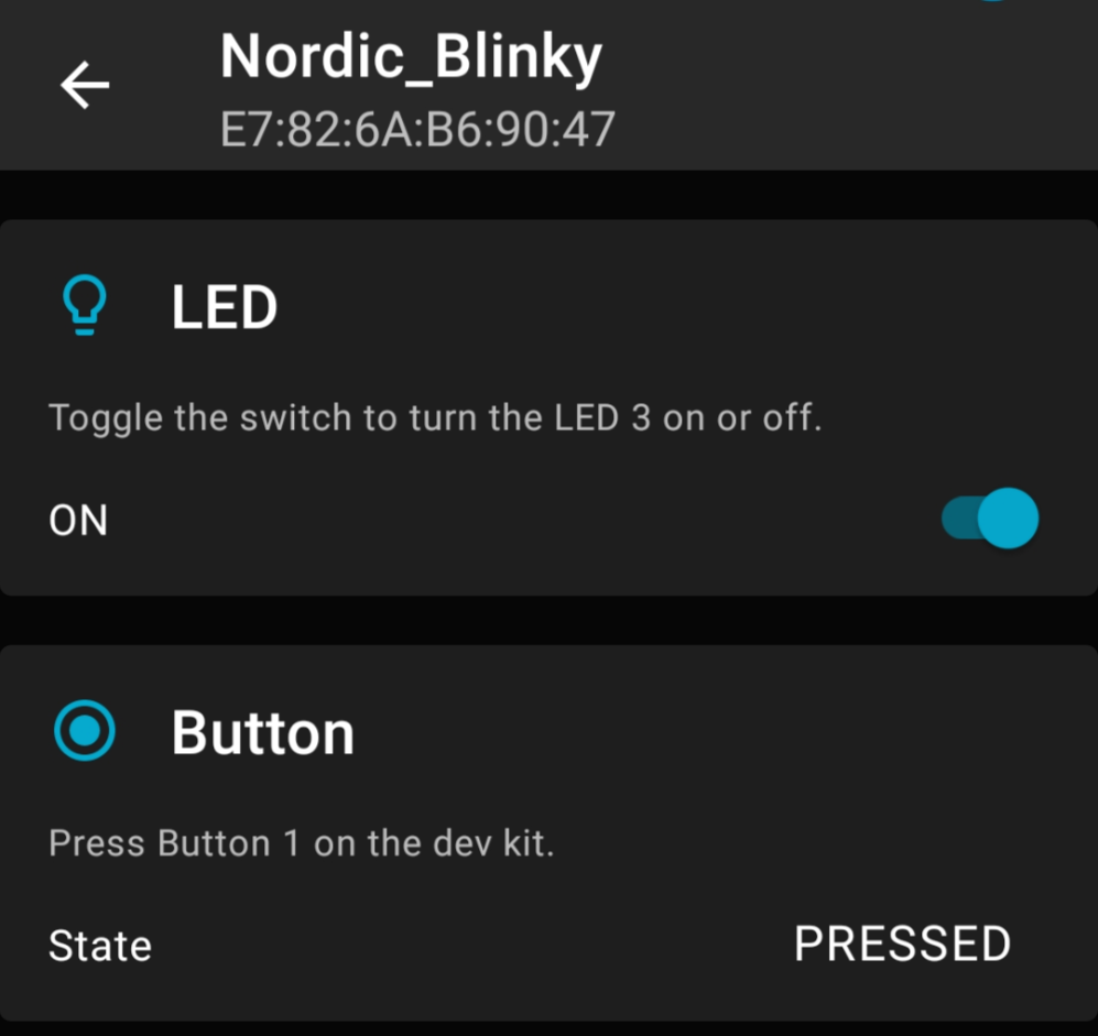 이제 목록에서 Nordic_Blinky를 선택해 페어링을 하면 사진과 같이 LED 스위치와 버튼 상태를 알려주는 화면이 나타난다.
