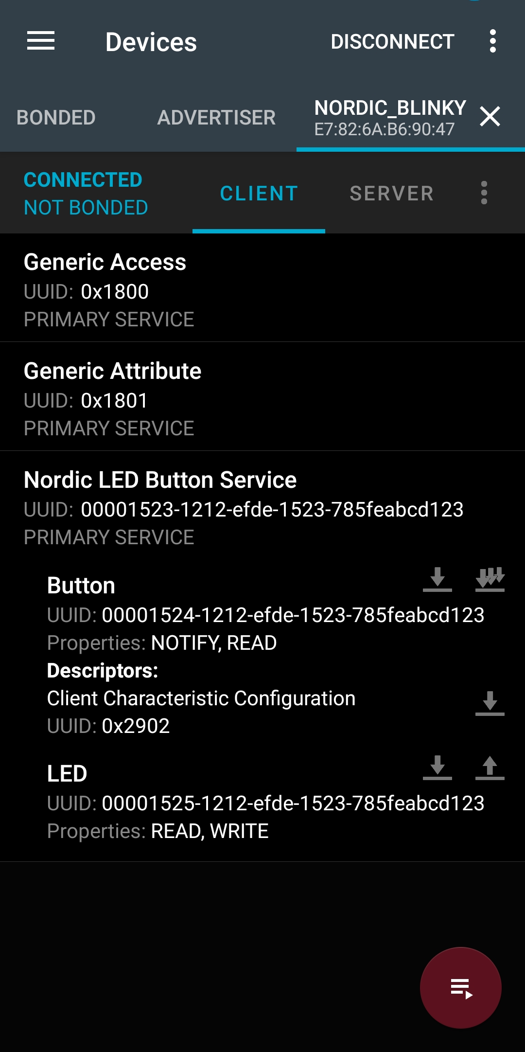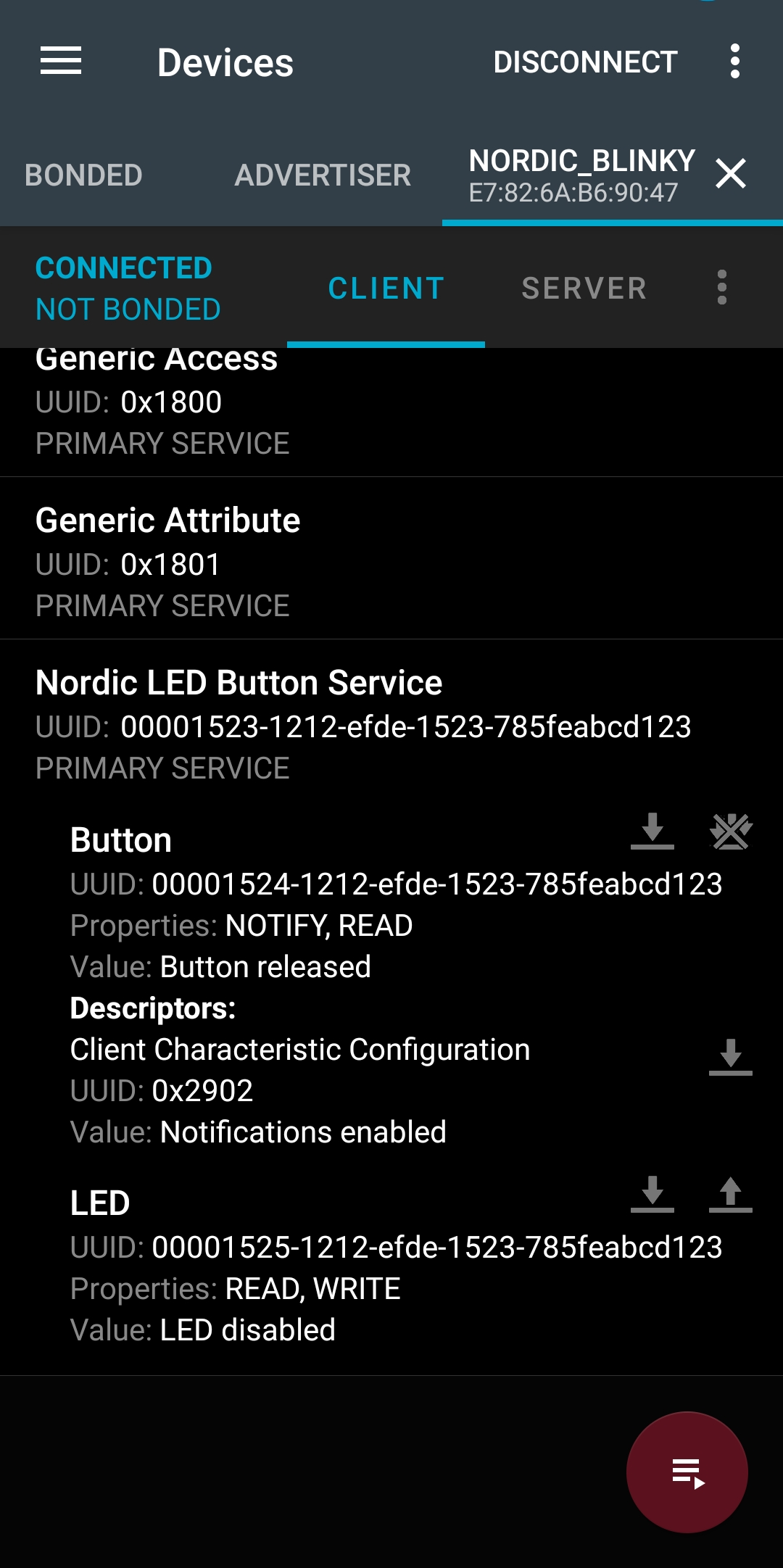목록에서 NORDIC_BLINKY를 선택해서 연결하면 사진과 같이 Nordic LED Button Service 항목이 나타나며 이를 선택하면 Button과 LED 서비스가 있는 것을 확인할 수 있다.