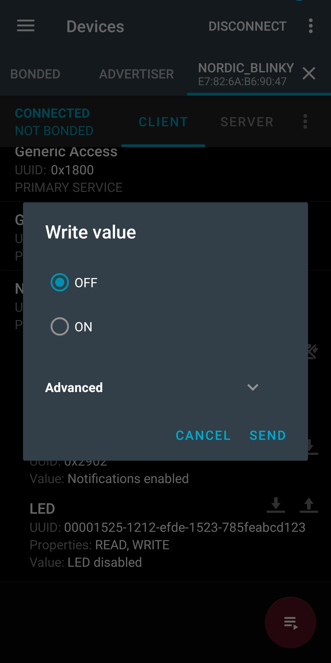 [⬆] 버튼을 눌러보면 Wirte value 창이 나타나고 OFF 또는 ON을 선택해 보낼 수 있다.