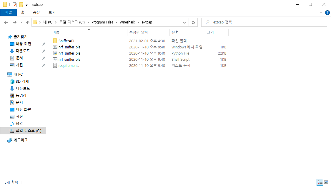 \nrf_sniffer_for_bluetooth_le_3.1.0_7cc811f\extcap 폴더 안의 파일들을 복사해 \Wireshark\extcap 폴더에 붙여 넣는다.