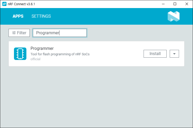 Search 창에서 Programmer를 검색하면 nRF Programmer 항목이 나타나며 Install 버튼을 눌러 설치하면 된다.