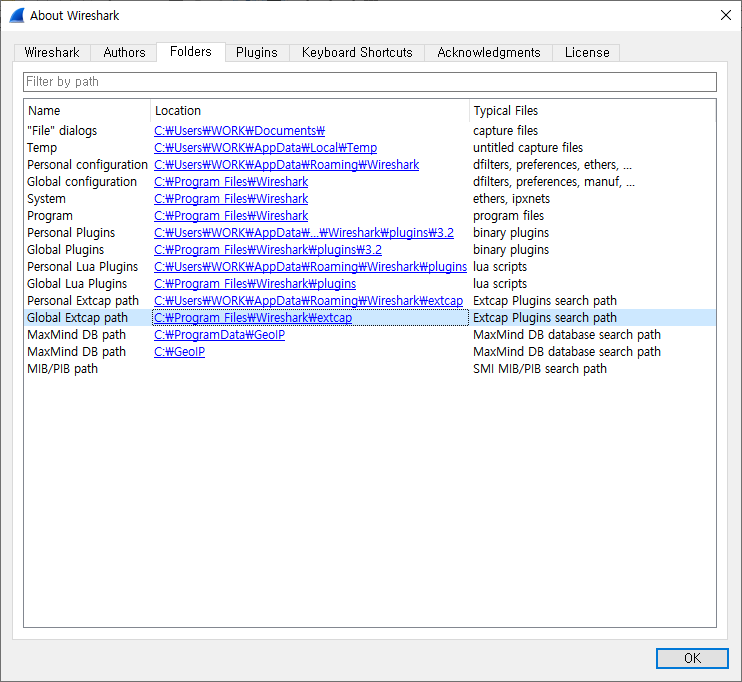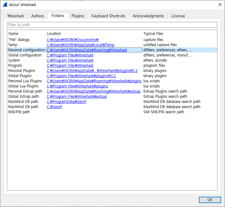 Wireshark 프로그램을 실행하고 메뉴바에서 Help > About Wireshark를 선택하고 Folders 탭으로 이동한다.