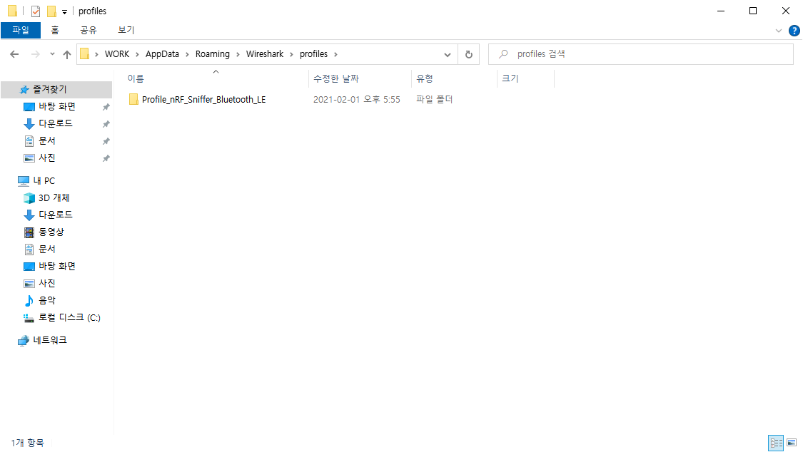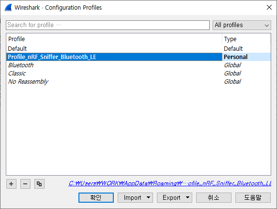 \nrf_sniffer_for_bluetooth_le_3.1.0_7cc811f 폴더 안의 Profile_nRF_Sniffer_Bluetooth_LE 폴더를 \Wireshark\profiles 폴더에 복사한다.