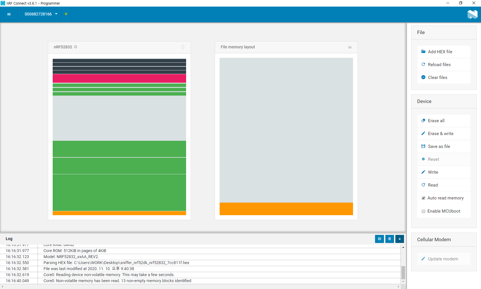 File 카테고리의 Add HEX file을 선택해 nRF Sniffer 펌웨어를 선택해주자.
