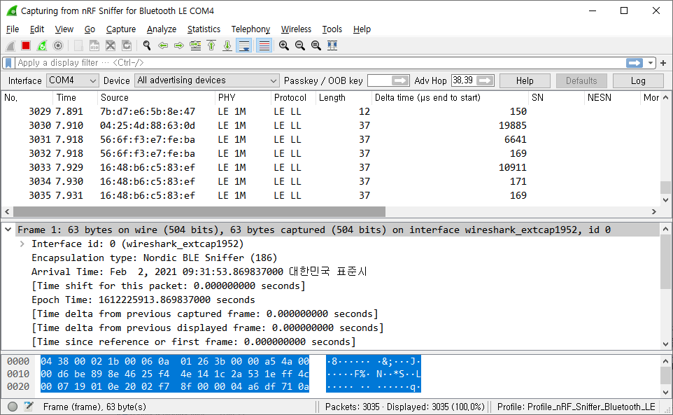nRF Sniffer for Bluetooth LE COMx를 더블 클릭하면 블루투스 패킷 캡처 화면으로 전환되며 주변의 블루투스 패킷들을 스니핑 할 수 있다.