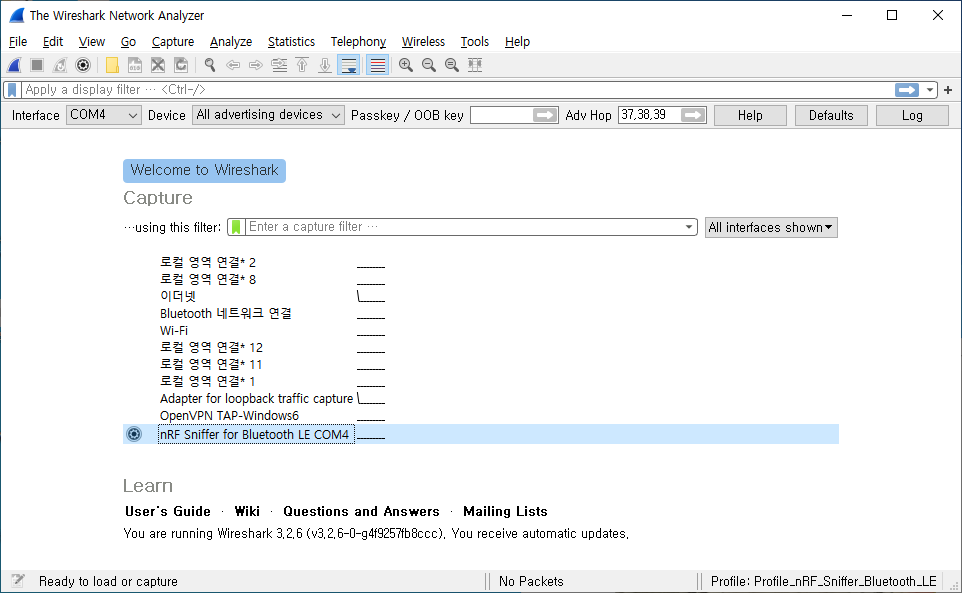 Wireshark 프로그램을 실행하면 시작 화면에 Interface Toolbar가 있으며 nRF Sniffer가 정상적으로 연결 상태라면 포트가 확인된다.