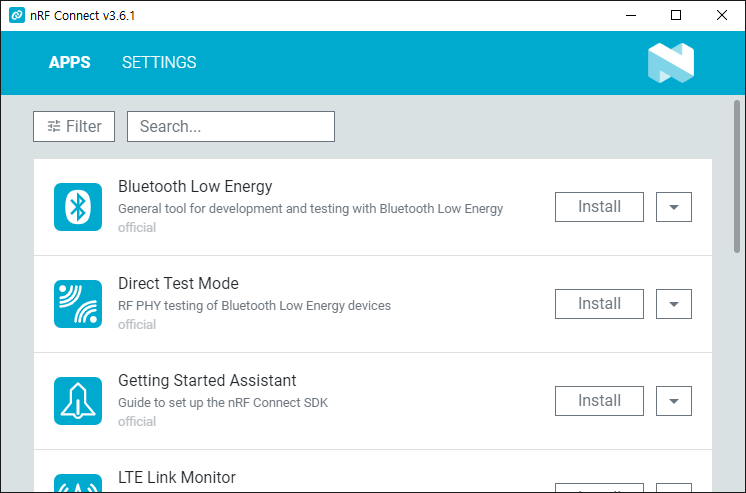 nRF Connect fo Desktop 프로그램 설치를 완료하고 실행하면 APP을 설치할 수 있는 창이 나타난다.