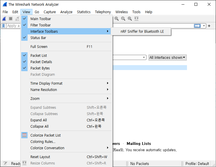 그리고 메뉴바에서 View > Interface Toolbars > nRF Sniffer for Bluetooth LE 항목을 선택해 활성화시켜준다.